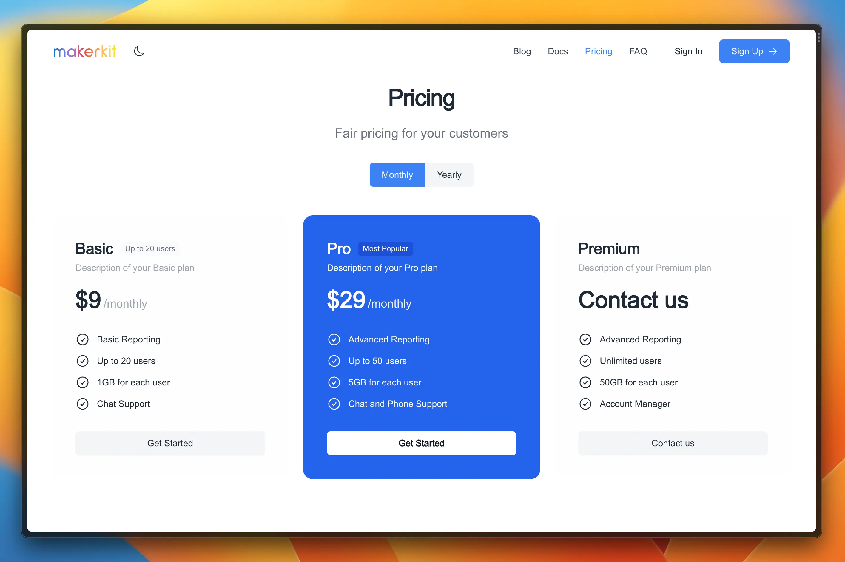 stripe: { products: [ { name: 'Basic', description: 'Description of your Basic plan', badge: `Up to 20 users`, features: [ 'Basic Reporting', 'Up to 20 users', '1GB for each user', 'Chat Support', ], plans: [ { name: 'Monthly', price: '$9', stripePriceId: 'basic-plan-mth', trialPeriodDays: 7, }, { name: 'Yearly', price: '$90', stripePriceId: 'basic-plan-yr', trialPeriodDays: 7, }, ], }, { name: 'Pro', badge: `Most Popular`, recommended: true, description: 'Description of your Pro plan', features: [ 'Advanced Reporting', 'Up to 50 users', '5GB for each user', 'Chat and Phone Support', ], plans: [ { name: 'Monthly', price: '$29', stripePriceId: 'pro-plan-mth', trialPeriodDays: 7, }, { name: 'Yearly', price: '$200', stripePriceId: 'pro-plan-yr', trialPeriodDays: 7, }, ], }, { name: 'Premium', description: 'Description of your Premium plan', badge: ``, features: [ 'Advanced Reporting', 'Unlimited users', '50GB for each user', 'Account Manager', ], plans: [ { name: '', price: 'Contact us', stripePriceId: '', trialPeriodDays: 7, label: `Contact us`, href: `/contact`, }, ], }, ],}There are various options available, such as: