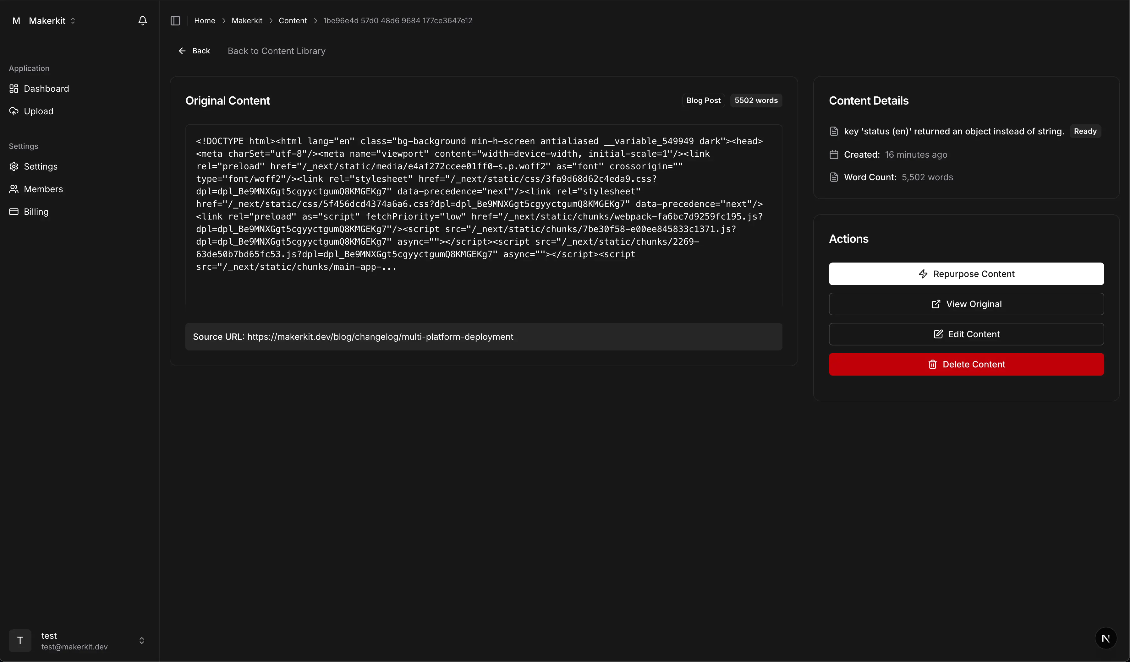 'use server';import { z } from 'zod';import { enhanceAction } from '@kit/next/actions';import { getLogger } from '@kit/shared/logger';import { getSupabaseServerAdminClient } from '@kit/supabase/server-admin-client';import { getSupabaseServerClient } from '@kit/supabase/server-client';import { ContentRepurposerService, type SupportedPlatform,} from '~/lib/ai/content-repurposer.service';const RepurposeContentSchema = z.object({ contentId: z.string().uuid(), accountId: z.string().uuid(), targetPlatforms: z .array( z.enum([ 'twitter', 'linkedin', 'instagram', 'facebook', 'tiktok', 'youtube', 'blog', 'newsletter', ]), ) .min(1, 'At least one platform is required'), customInstructions: z.string().optional(), tone: z.string().optional(),});export const repurposeContentAction = enhanceAction( async function repurposeContent(data, user) { const client = getSupabaseServerClient(); const adminClient = getSupabaseServerAdminClient(); const logger = await getLogger(); const ctx = { name: 'repurposeContentAction', userId: user.id, contentId: data.contentId, accountId: data.accountId, platforms: data.targetPlatforms, }; logger.info(ctx, 'Starting content repurposing process'); try { const { data: content, error: contentError } = await client .from('original_content') .select('*') .eq('id', data.contentId) .eq('account_id', data.accountId) .single(); if (contentError || !content) { throw new Error('Content not found'); } if (content.status !== 'uploaded' && content.status !== 'completed') { throw new Error('Content is not ready for repurposing'); } // 3. Calculate credit cost (1 credit per platform) const creditsCost = data.targetPlatforms.length; // 4. Check if account has sufficient credits before creating job const { data: creditCheck } = await adminClient .from('account_credits') .select('remaining_credits') .eq('account_id', data.accountId) .lte('billing_period_start', new Date().toISOString()) .gt('billing_period_end', new Date().toISOString()) .order('billing_period_start', { ascending: false }) .limit(1) .single(); if (!creditCheck || (creditCheck.remaining_credits || 0) < creditsCost) { throw new Error( 'Insufficient credits. Please purchase more credits to continue.', ); } // 5. Create a repurposing job record const { data: job, error: jobError } = await client .from('repurposing_jobs') .insert({ account_id: data.accountId, original_content_id: data.contentId, target_platforms: data.targetPlatforms, custom_instructions: data.customInstructions, tone: data.tone, status: 'processing', credits_cost: creditsCost, created_by: user.id, }) .select() .single(); if (jobError || !job) { throw new Error('Failed to create repurposing job'); } logger.info({ ...ctx, jobId: job.id }, 'Created repurposing job'); // 6. Now consume credits with the actual job ID const consumeResult = await adminClient.rpc('consume_credits', { p_account_id: data.accountId, p_amount: creditsCost, p_job_id: job.id, p_description: `Content repurposing for ${data.targetPlatforms.length} platform(s)`, }); if (!consumeResult.data) { // If credit consumption fails, clean up the job await client .from('repurposing_jobs') .delete() .eq('id', job.id); throw new Error( 'Failed to consume credits. Please try again.', ); } // 7. Process with AI service try { const repurposerService = new ContentRepurposerService(); const result = await repurposerService.repurposeContent({ originalContent: content.original_text, contentType: content.content_type, targetPlatforms: data.targetPlatforms as SupportedPlatform[], customInstructions: data.customInstructions, tone: data.tone, }); if (!result.success) { throw new Error(result.error || 'AI processing failed'); } // 8. Save variations to database const variations = result.variations.map((variation) => ({ account_id: data.accountId, job_id: job.id, original_content_id: data.contentId, platform: variation.platform, content_text: variation.content, character_count: variation.characterCount, hashtags: variation.hashtags, mentions: variation.mentions, ai_confidence_score: variation.metadata.confidence, platform_metadata: { model: variation.metadata.model, tokens_used: variation.metadata.tokensUsed, }, })); const { error: variationsError } = await client .from('content_variations') .insert(variations); if (variationsError) { throw new Error('Failed to save content variations'); } // 9. Update job status to completed await client .from('repurposing_jobs') .update({ status: 'completed', processing_completed_at: new Date().toISOString(), ai_model_used: 'gpt-4o-mini', processing_duration_ms: result.processingTimeMs, tokens_consumed: result.totalTokensUsed, }) .eq('id', job.id); logger.info( { ...ctx, jobId: job.id, variationsCount: variations.length, tokensUsed: result.totalTokensUsed, processingTimeMs: result.processingTimeMs, }, 'Content repurposing completed successfully', ); return { success: true, data: { jobId: job.id, variationsCount: variations.length, tokensUsed: result.totalTokensUsed, processingTimeMs: result.processingTimeMs, }, }; } catch (aiError) { // Update job status to failed await client .from('repurposing_jobs') .update({ status: 'failed', error_message: aiError instanceof Error ? aiError.message : 'Unknown AI processing error', }) .eq('id', job.id); // Note: We don't refund credits for failed AI processing // as the credits were consumed for the attempt logger.error( { ...ctx, jobId: job.id, error: aiError }, 'AI processing failed after credit consumption' ); throw aiError; } } catch (error) { logger.error({ ...ctx, error }, 'Content repurposing failed'); return { success: false, error: error instanceof Error ? error.message : 'Repurposing failed', }; } }, { auth: true, schema: RepurposeContentSchema, },);When you kick-off a generation job, here's what the variations page looks like (without any follow-up adjustments or fixes):