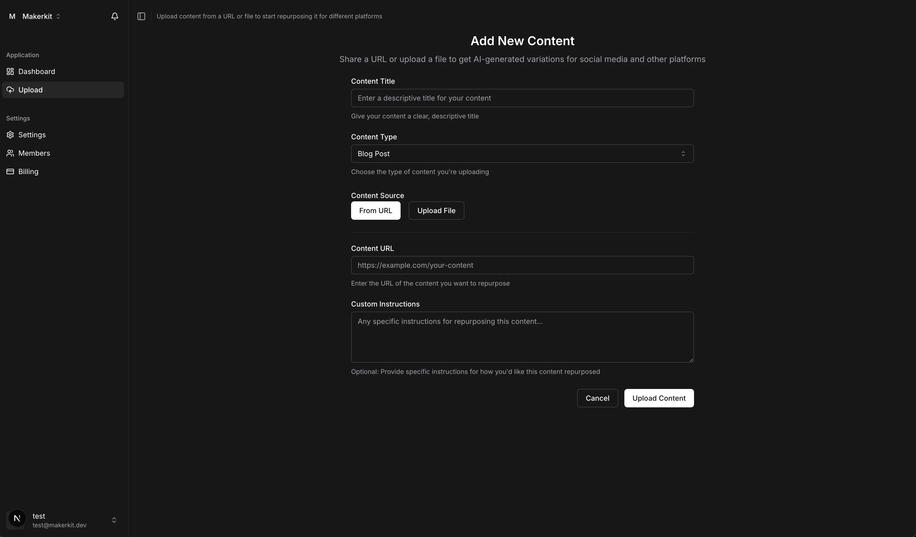import { z } from 'zod';export const ContentUploadSchema = z.object({ title: z.string().min(1, 'Title is required').max(200, 'Title is too long'), contentType: z.enum(['blog_post', 'article', 'social_media_post', 'newsletter', 'video_script', 'podcast_script'], { required_error: 'Content type is required', }), // Either URL or file upload is required contentUrl: z.string().url('Please enter a valid URL').optional().or(z.literal('')), // File validation file: z .custom<File>((val) => val instanceof File, 'Please upload a file') .refine( (file) => file.size <= 5 * 1024 * 1024, // 5MB limit 'File size must be less than 5MB' ) .refine( (file) => ['text/markdown', 'text/plain', 'application/octet-stream'].includes(file.type) || file.name.endsWith('.md') || file.name.endsWith('.txt'), 'Only markdown (.md) and text (.txt) files are supported' ) .optional(), tags: z.array(z.string()).optional().default([]), customInstructions: z.string().max(1000, 'Instructions are too long').optional(),}).refine( (data) => data.contentUrl || data.file, { message: 'Either provide a URL or upload a file', path: ['contentUrl'], });export type ContentUploadFormData = z.infer<typeof ContentUploadSchema>;The page to upload content