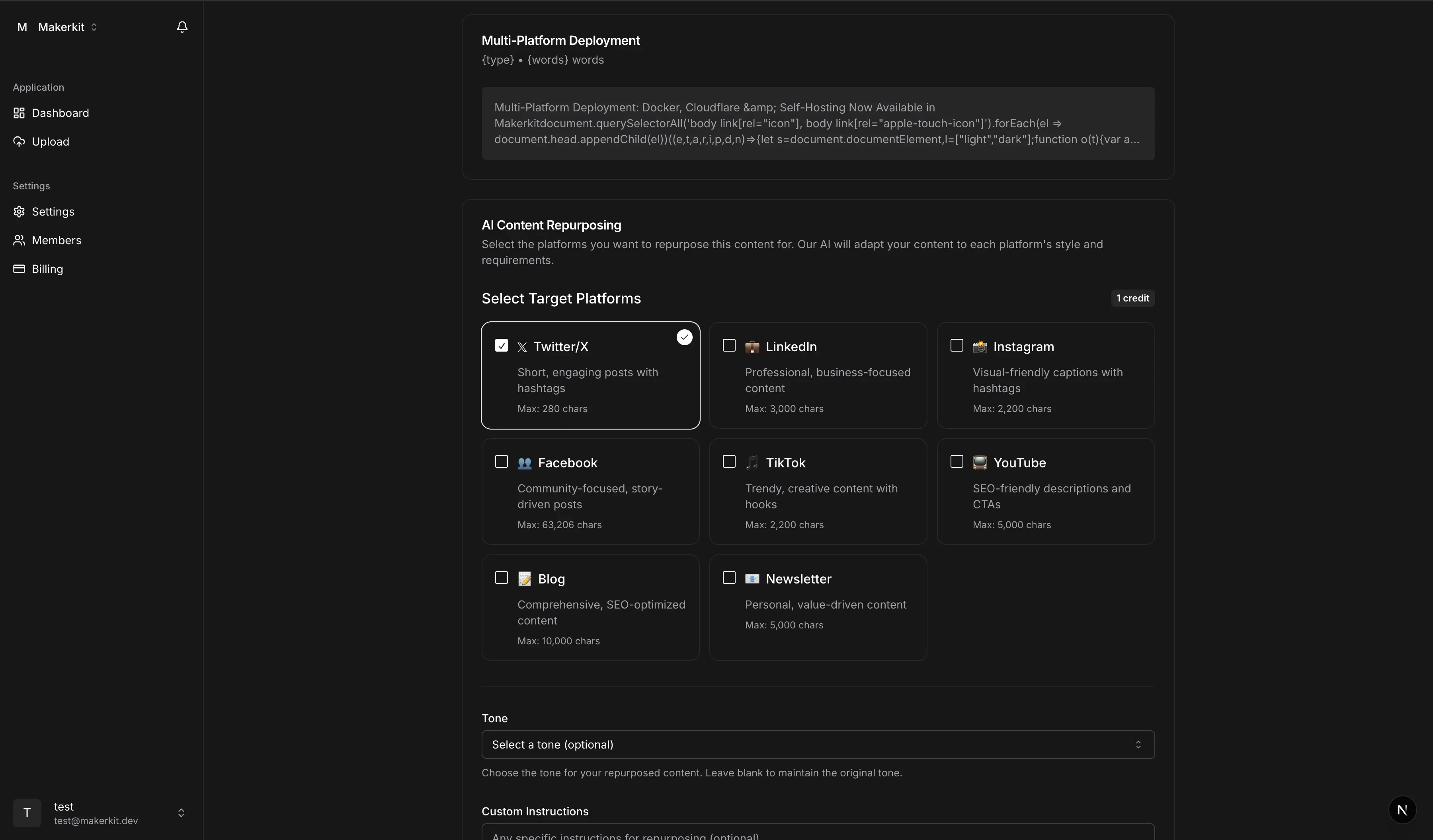 'use client';import { Check } from 'lucide-react';import { Badge } from '@kit/ui/badge';import { Card, CardContent } from '@kit/ui/card';import { Checkbox } from '@kit/ui/checkbox';import { If } from '@kit/ui/if';import { Trans } from '@kit/ui/trans';import { PLATFORM_OPTIONS } from '../_lib/schema/repurpose.schema';interface PlatformSelectorProps { selectedPlatforms: string[]; onPlatformsChange: (platforms: string[]) => void; creditsPerPlatform?: number;}export function PlatformSelector({ selectedPlatforms, onPlatformsChange, creditsPerPlatform = 1,}: PlatformSelectorProps) { const handlePlatformToggle = (platformValue: string) => { const newPlatforms = selectedPlatforms.includes(platformValue) ? selectedPlatforms.filter((p) => p !== platformValue) : [...selectedPlatforms, platformValue]; onPlatformsChange(newPlatforms); }; const totalCredits = selectedPlatforms.length * creditsPerPlatform; return ( <div className="space-y-4"> <div className="flex items-center justify-between"> <h3 className="text-lg font-medium"> <Trans i18nKey="repurpose:selectPlatforms" defaults="Select Target Platforms" /> </h3> <If condition={selectedPlatforms.length > 0}> <Badge variant="secondary"> {totalCredits} credit{totalCredits !== 1 ? 's' : ''} </Badge> </If> </div> <div className="grid gap-3 sm:grid-cols-2 lg:grid-cols-3"> {PLATFORM_OPTIONS.map((platform) => { const isSelected = selectedPlatforms.includes(platform.value); return ( <Card key={platform.value} className={`relative transition-all hover:shadow-md ${ isSelected ? 'ring-primary ring' : '' }`} > <CardContent className="p-4"> <label className="flex items-start space-x-3"> <Checkbox checked={isSelected} className="mt-1 cursor-pointer" onCheckedChange={() => handlePlatformToggle(platform.value)} /> <div className="flex-1 space-y-2"> <div className="flex items-center gap-2"> <span className="text-lg">{platform.icon}</span> <h4 className="font-medium">{platform.label}</h4> </div> <p className="text-muted-foreground text-sm"> {platform.description} </p> <div className="text-muted-foreground text-xs"> Max: {platform.maxLength.toLocaleString()} chars </div> </div> </label> <If condition={isSelected}> <div className="absolute top-2 right-2"> <div className="bg-primary text-primary-foreground flex h-5 w-5 items-center justify-center rounded-full"> <Check className="h-3 w-3" /> </div> </div> </If> </CardContent> </Card> ); })} </div> <If condition={selectedPlatforms.length === 0}> <p className="text-muted-foreground py-4 text-center text-sm"> <Trans i18nKey="repurpose:selectPlatformsHelper" defaults="Choose one or more platforms to repurpose your content for. Each platform costs 1 credit." /> </p> </If> </div> );}And the form that allows the user to select the platforms and submit the repurposing job: