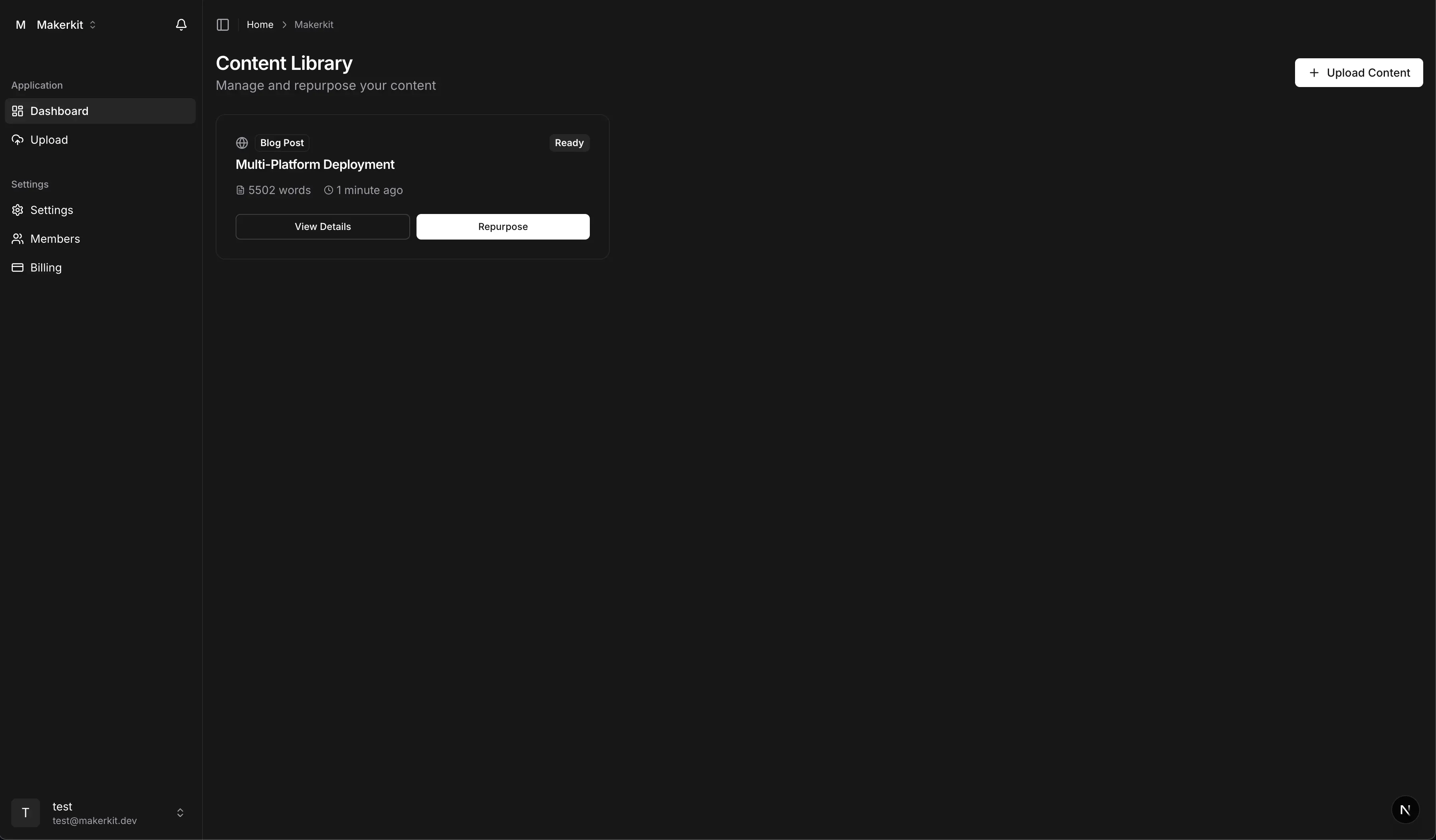 import { use } from 'react';import Link from 'next/link';import { ArrowLeft } from 'lucide-react';import { AppBreadcrumbs } from '@kit/ui/app-breadcrumbs';import { Button } from '@kit/ui/button';import { PageBody } from '@kit/ui/page';import { Trans } from '@kit/ui/trans';import { createI18nServerInstance } from '~/lib/i18n/i18n.server';import { withI18n } from '~/lib/i18n/with-i18n';import { TeamAccountLayoutPageHeader } from '../../_components/team-account-layout-page-header';import { loadTeamWorkspace } from '../../_lib/server/team-account-workspace.loader';import { ContentActions } from './_components/content-actions';import { ContentMetadata } from './_components/content-metadata';import { ContentPreview } from './_components/content-preview';import { loadContentDetail } from './_lib/server/content-detail.loader';interface ContentDetailPageProps { params: Promise<{ account: string; id: string }>;}export const generateMetadata = async ({ params }: ContentDetailPageProps) => { const { account: accountSlug, id: contentId } = await params; try { const workspace = await loadTeamWorkspace(accountSlug); const contentData = await loadContentDetail(workspace.account.id, contentId); const i18n = await createI18nServerInstance(); const title = i18n.t('content:detailPageTitle', { defaultValue: `${contentData.content.title} - Content Details`, title: contentData.content.title, }); return { title, }; } catch { const i18n = await createI18nServerInstance(); return { title: i18n.t('content:detailPageTitle', { defaultValue: 'Content Details' }), }; }};async function ContentDetailPage({ params }: ContentDetailPageProps) { const { account: accountSlug, id: contentId } = await params; // Load workspace to get account ID const workspace = await loadTeamWorkspace(accountSlug); const accountId = workspace.account.id; // Load content details const contentData = await loadContentDetail(accountId, contentId); return ( <> <TeamAccountLayoutPageHeader account={accountSlug} title={contentData.content.title} description={<AppBreadcrumbs />} /> <PageBody> <div className="space-y-6"> {/* Back Navigation */} <div className="flex items-center gap-4"> <Button asChild variant="ghost" size="sm"> <Link href={`/home/${accountSlug}`}> <ArrowLeft className="mr-2 h-4 w-4" /> <Trans i18nKey="common:back" defaults="Back" /> </Link> </Button> <div className="text-sm text-muted-foreground"> <Trans i18nKey="content:backToLibrary" defaults="Back to Content Library" /> </div> </div> {/* Main Content Layout */} <div className="grid gap-6 lg:grid-cols-3"> {/* Content Preview - Takes up 2/3 of the space */} <div className="lg:col-span-2"> <ContentPreview content={contentData.content} /> </div> {/* Sidebar - Metadata and Actions */} <div className="space-y-6"> <ContentMetadata content={contentData.content} /> <ContentActions content={contentData.content} accountSlug={accountSlug} canEdit={contentData.canEdit} /> </div> </div> {/* Processing Jobs Section (if any) */} {/* TODO: Add processing jobs display component */} {/* Variations Section (if any) */} {/* TODO: Add content variations display component */} </div> </PageBody> </> );}export default withI18n(ContentDetailPage);That's it for now. We have a working content list and detail page!