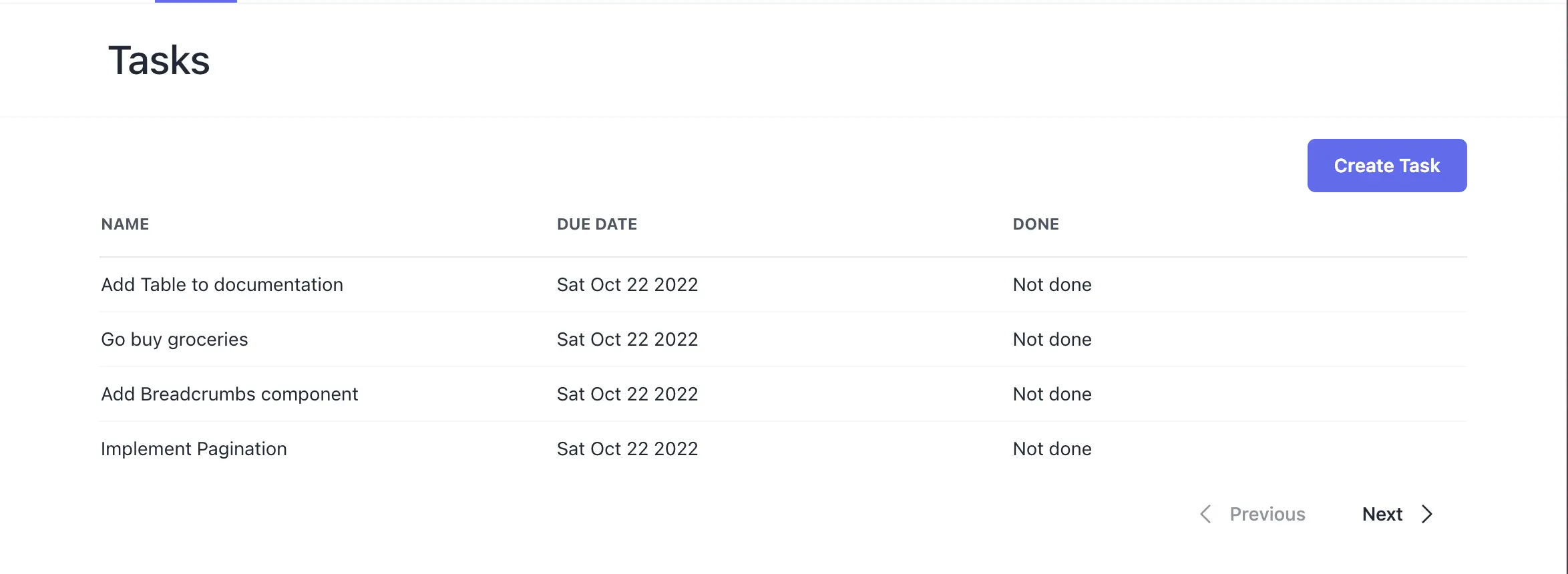 We create two components: a table named TasksTable and a pagination component named Pagination.