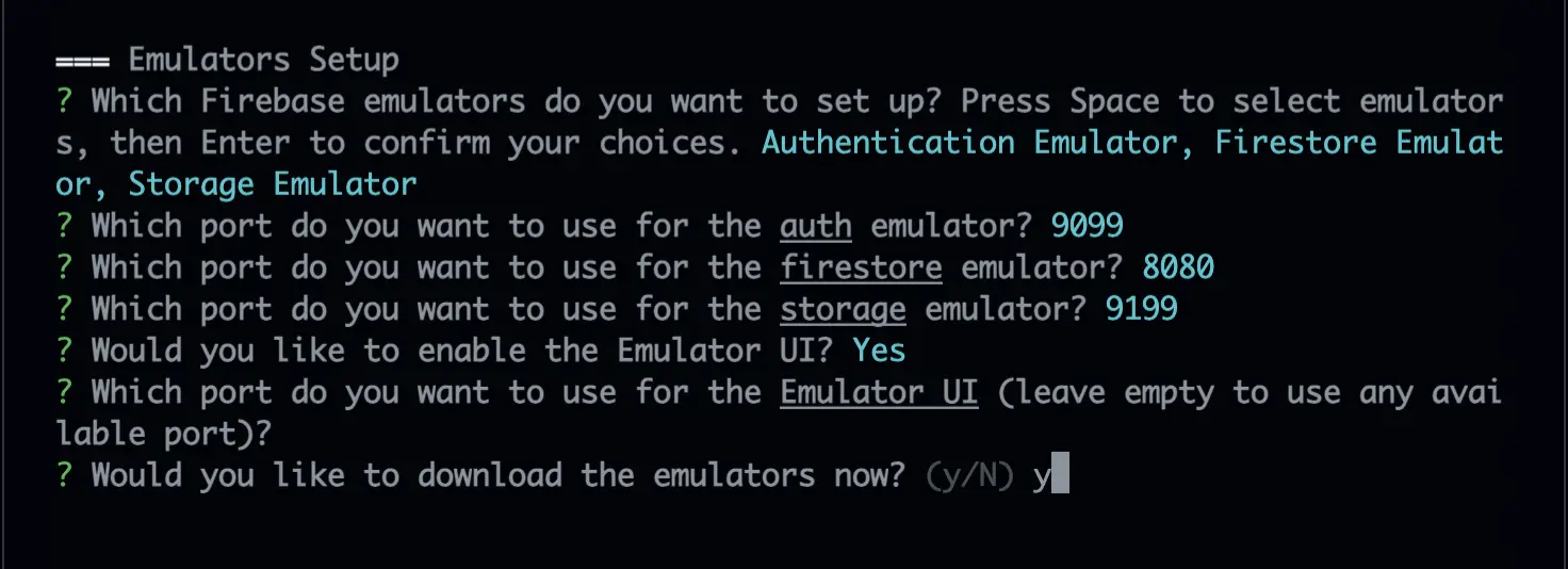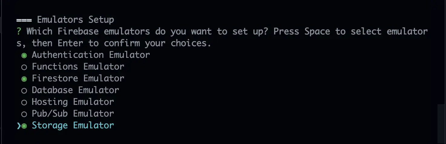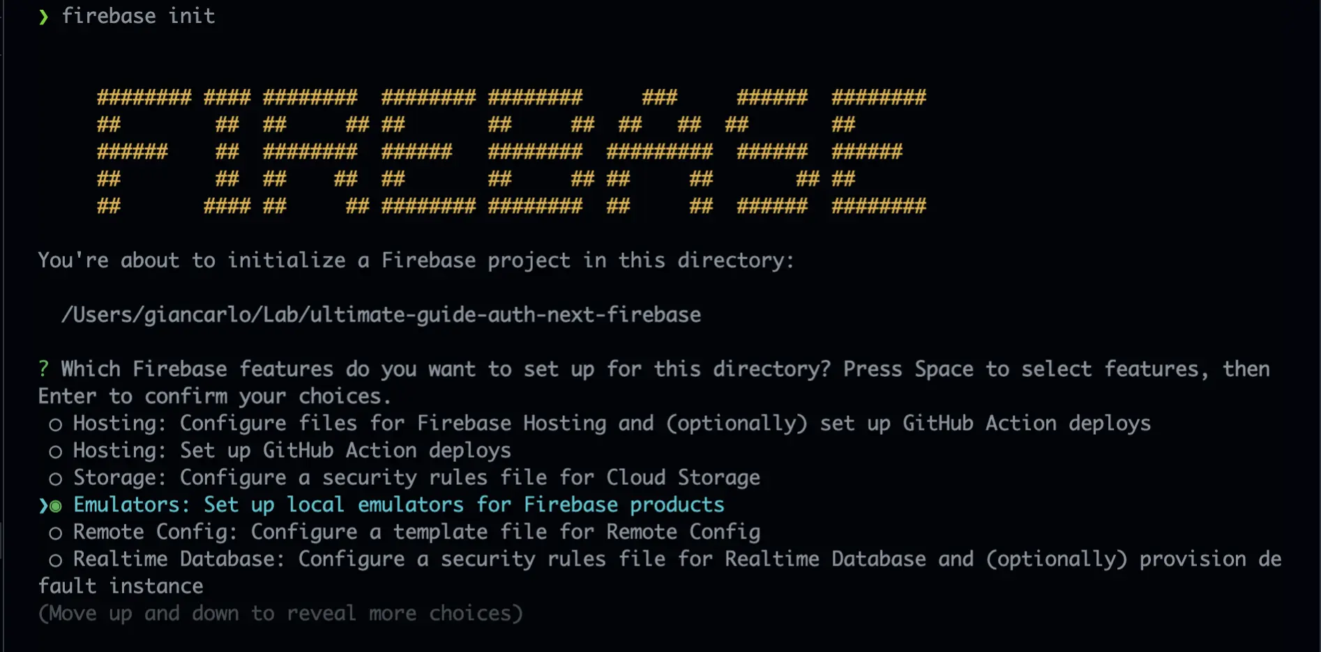 The CLI should output the emulators you want to install: if you're unsure which ones you want, select them all except for Realtime DB and Cloud Functions. As you're using NextJS, we assume you want to use Vercel's API functions: