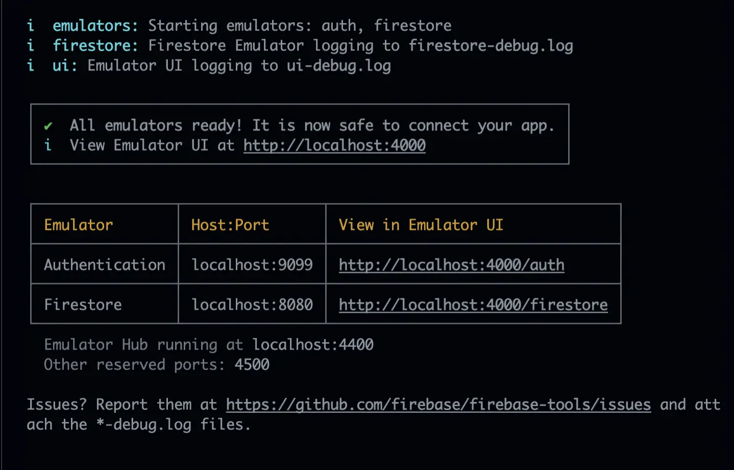 { "scripts": { "firebase:emulators:start": "firebase emulators:start" }}Assuming everything went well, you should see the output below: