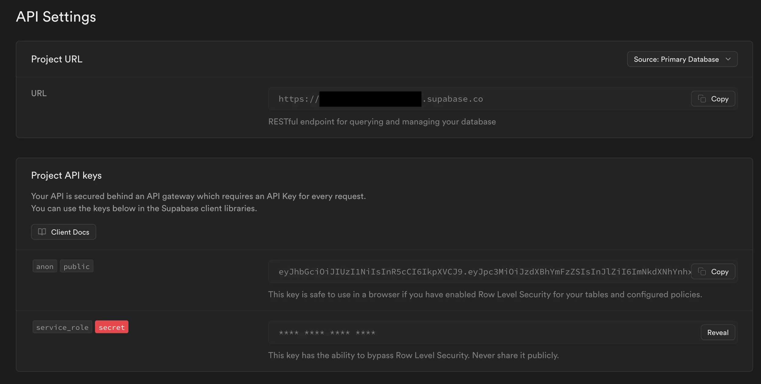 - Service Role Key: this is the secret key that grants administrative access to your Supabase project.