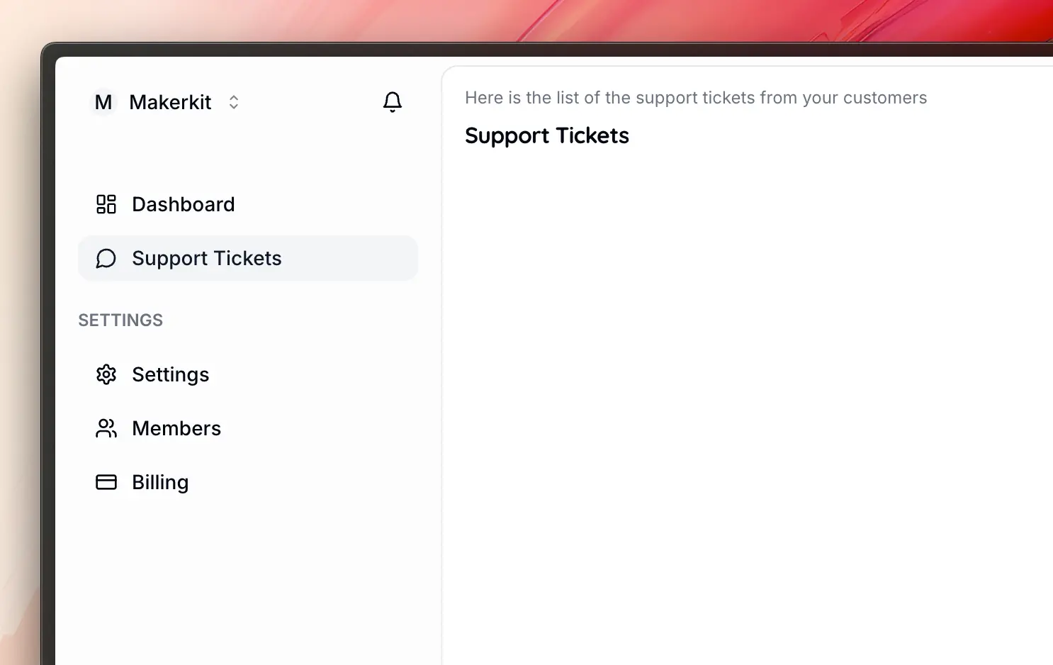 import { CreditCard, LayoutDashboard, Settings, Users, MessageCircle } from 'lucide-react';//..const getRoutes = (account: string) => [ { label: 'common:routes.application', children: [ { label: 'common:routes.dashboard', path: pathsConfig.app.accountHome.replace('[account]', account), Icon: <LayoutDashboard className={iconClasses} />, end: true, }, { label: 'Support Tickets', collapsible: false, path: `/home/${account}/tickets`, Icon: <MessageCircle className={iconClasses} />, }, ] }, { label: 'common:routes.settings', collapsible: false, children: [ { label: 'common:routes.settings', path: createPath(pathsConfig.app.accountSettings, account), Icon: <Settings className={iconClasses} />, }, { label: 'common:routes.members', path: createPath(pathsConfig.app.accountMembers, account), Icon: <Users className={iconClasses} />, }, featureFlagsConfig.enableTeamAccountBilling ? { label: 'common:routes.billing', path: createPath(pathsConfig.app.accountBilling, account), Icon: <CreditCard className={iconClasses} />, } : undefined, ].filter(Boolean), },];Creating the Support Tickets Page and retrieving data