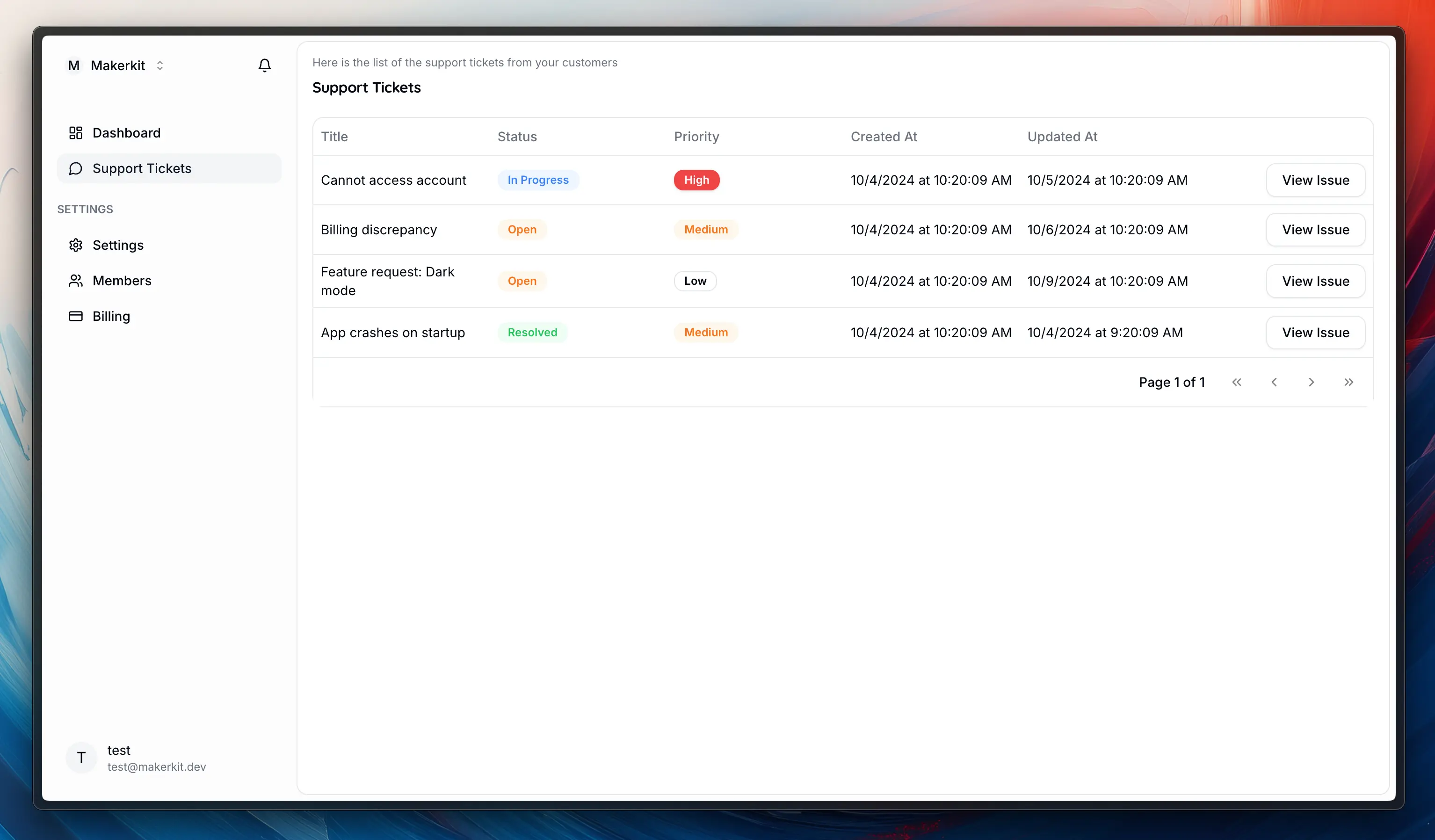 - Support Tickets List: A page for team accounts where support agents can view new support tickets.