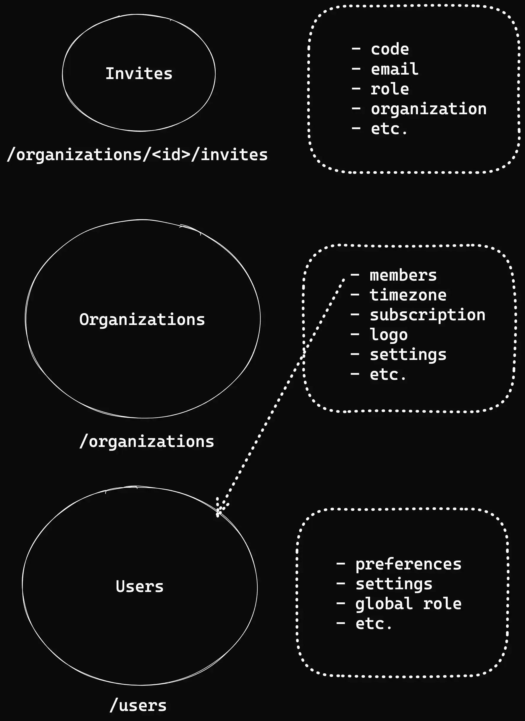 - Invites: invites are a sub-collection of organizations used to store invitations that users can accept.