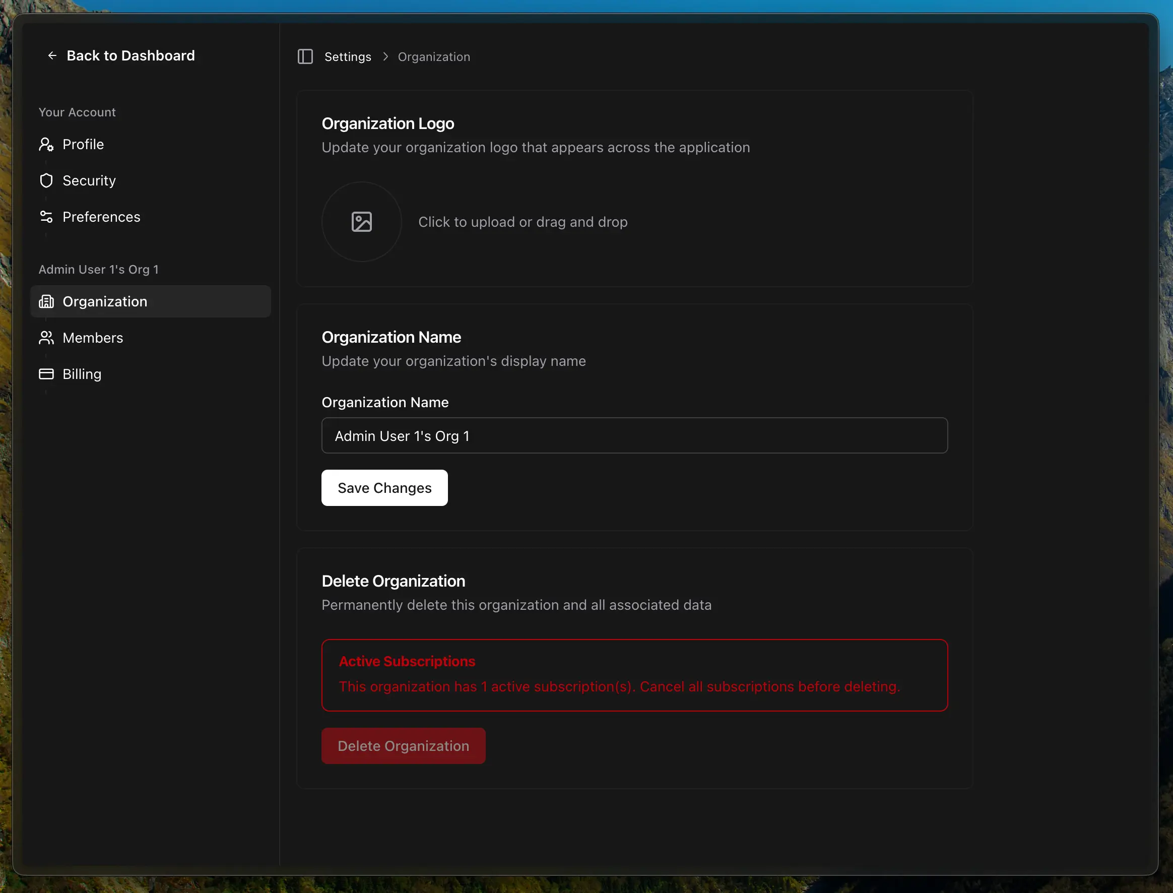 /settings/subscription. - Expecting slug changes: The organization name is display-only. Slugs are immutable after creation.