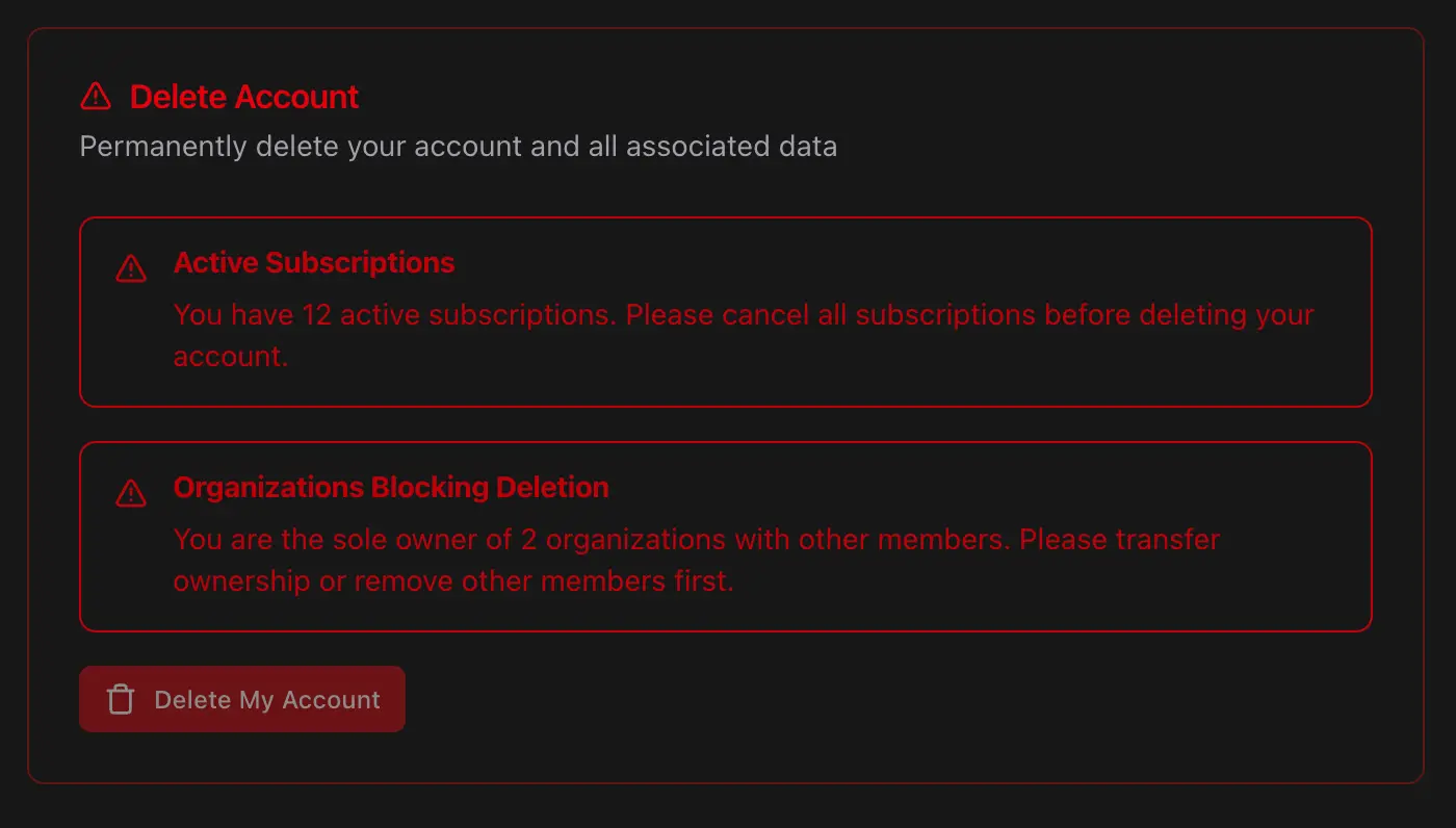 revalidatePathafter profile updates. - Blocking deletion without clear remediation: If account deletion fails due to active subscriptions or owned organizations, show users exactly what to do: link to billing settings and organization transfer.