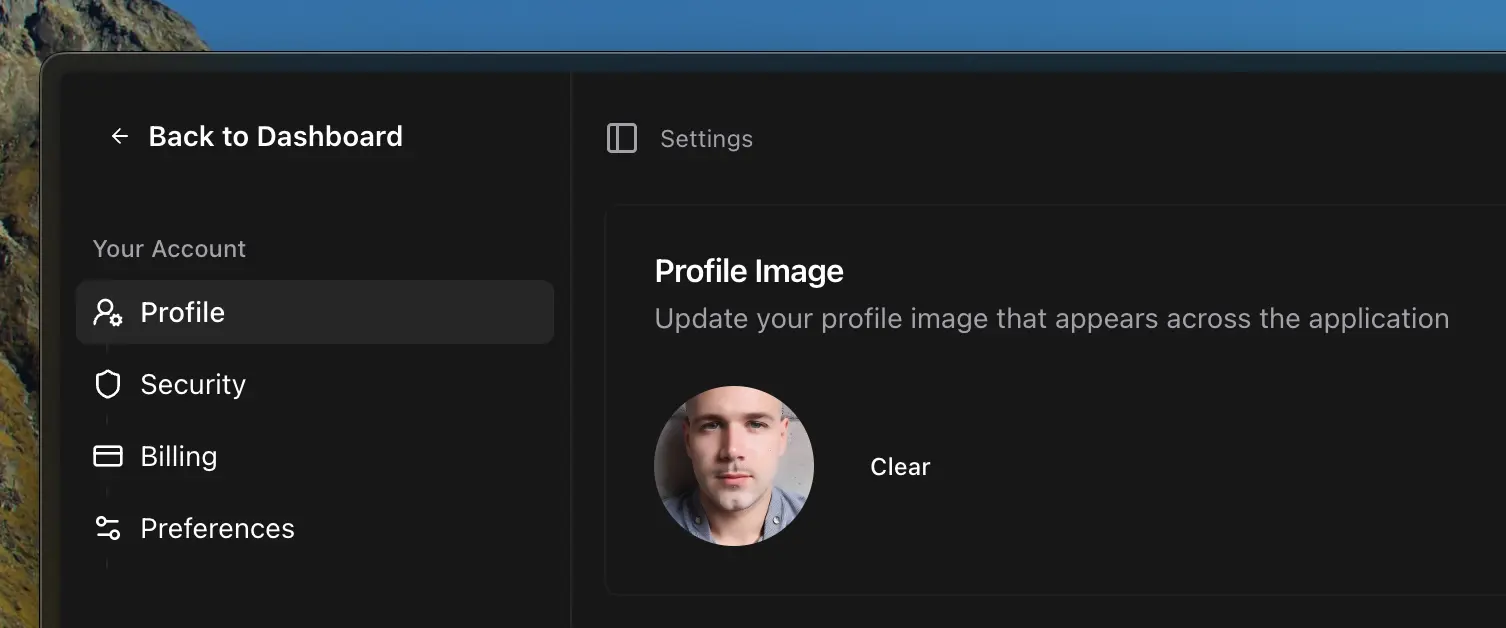 Profile settings let users manage their identity across your application - display name, avatar image, and account lifecycle. Changes sync instantly across all contexts where user information appears, including navigation headers, team member lists, and comments.
