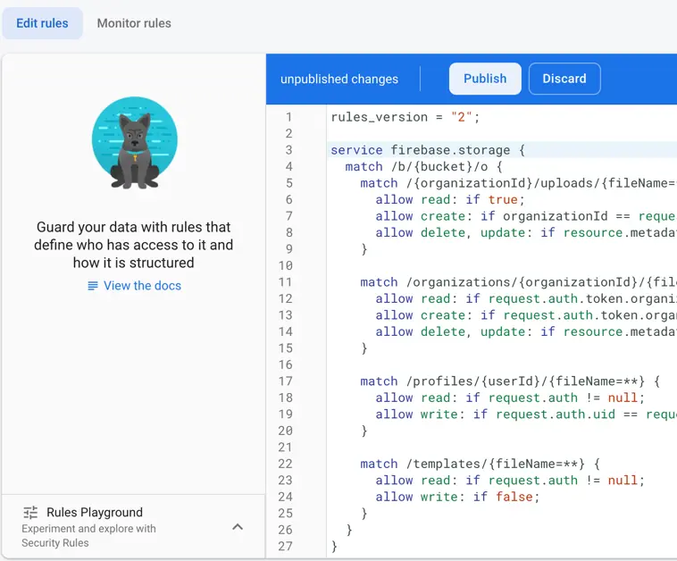 To update your Firestore Security rules, follow the same steps as for the Storage rules explained above.